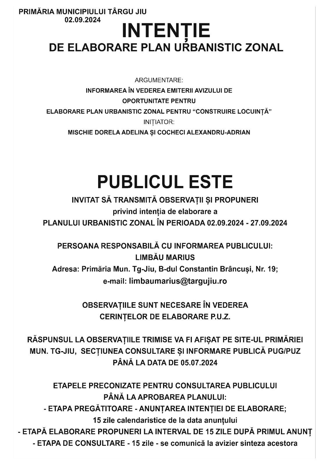 ANUNT PRIVIND INTENTIA DE ELABORARE PUZ- CONSTRUIRE LOCUINTA, STRADA UNIRII, NR.92, MUNICIPIUL TARGU JIU, JUDETUL GORJ- MISCHIE DORELA ADELINA