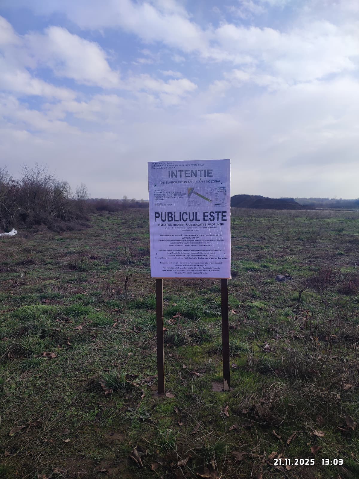 ANUNT PRIVIND INTENTIA DE ELABORARE PUZ: INTRODUCERE TEREN IN INTRAVILAN PENTRU CONSTRUIRE SPATII BIROURI SI SPATII DEPOZITARE, PARC FOTOVOLTAIC, STRADA NARCISELOR, FN, MUNICIPIUL TARGU JIU, JUDETUL GORJ- MECU NICOLAE VICTOR