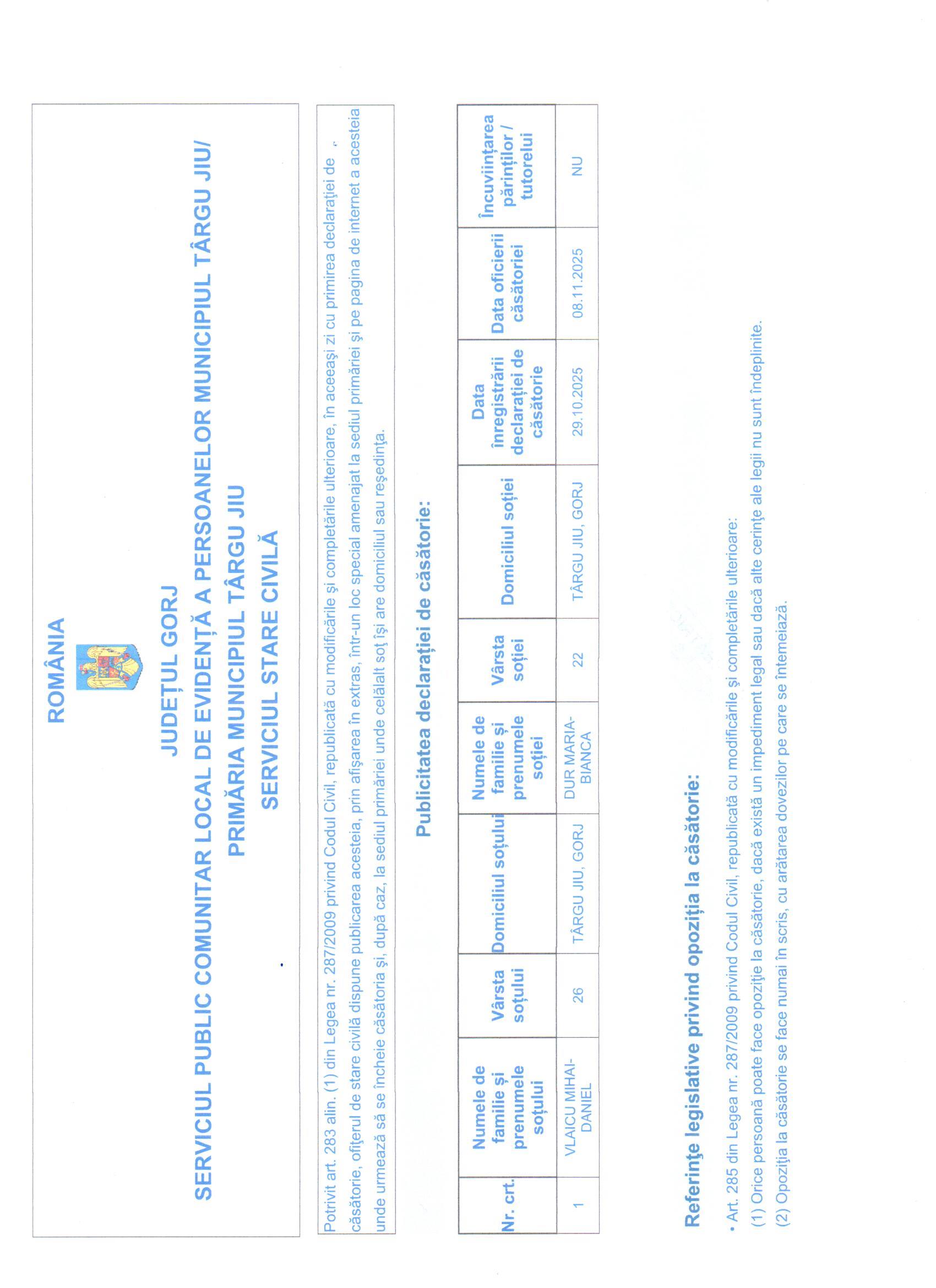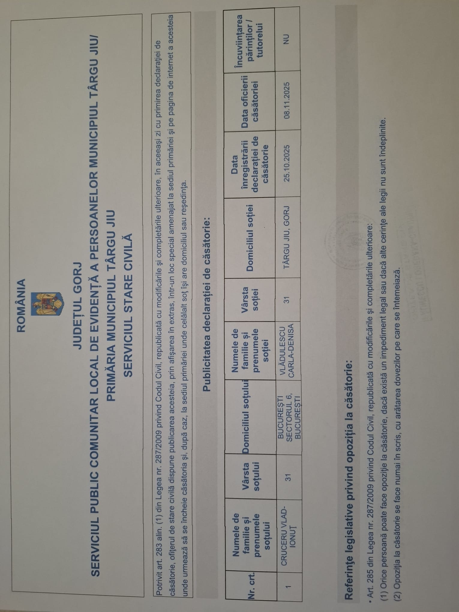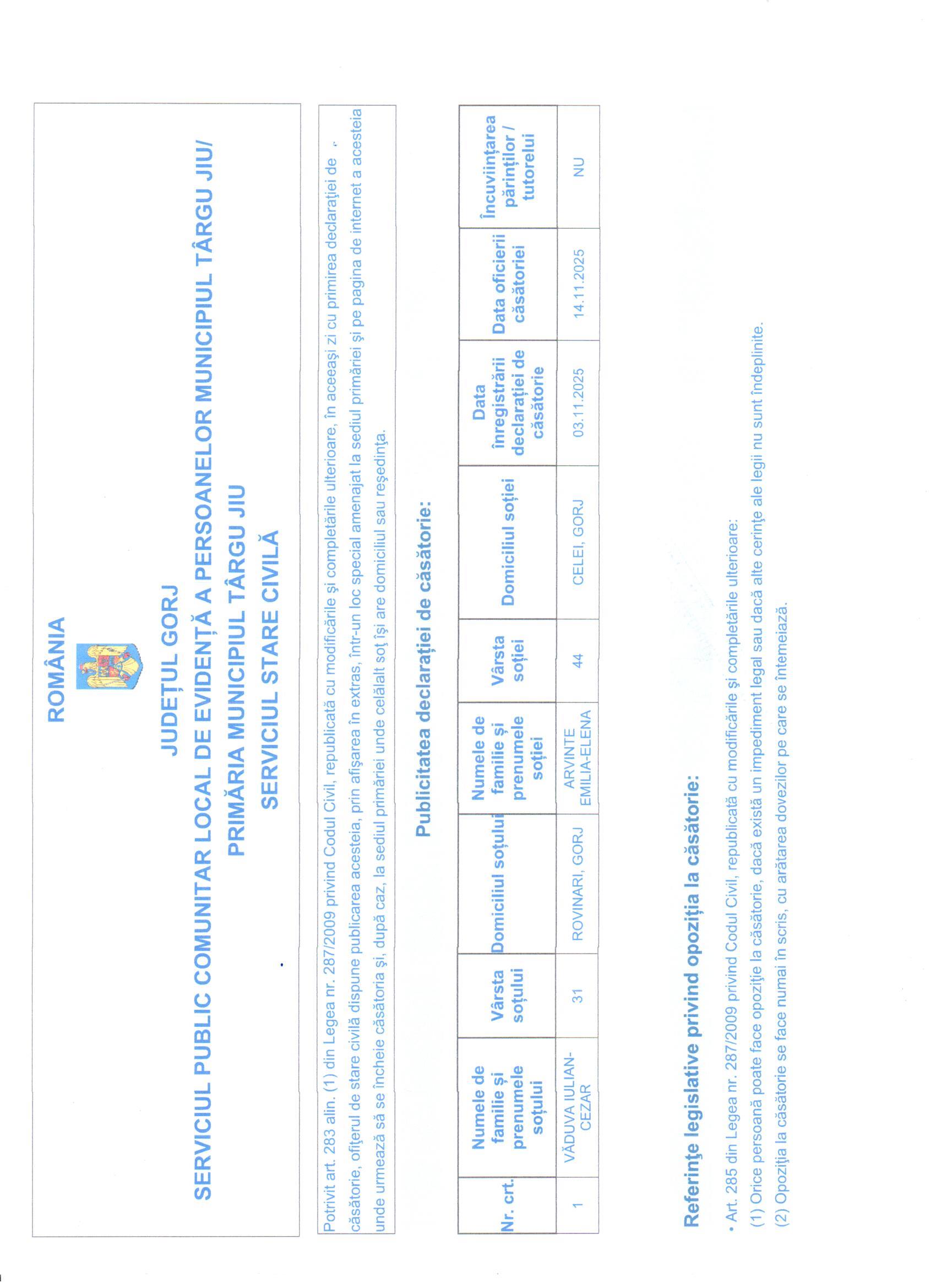149/2025 Publicații căsătorii: 14.11.2025 Data înregistrării: 03.11.2025