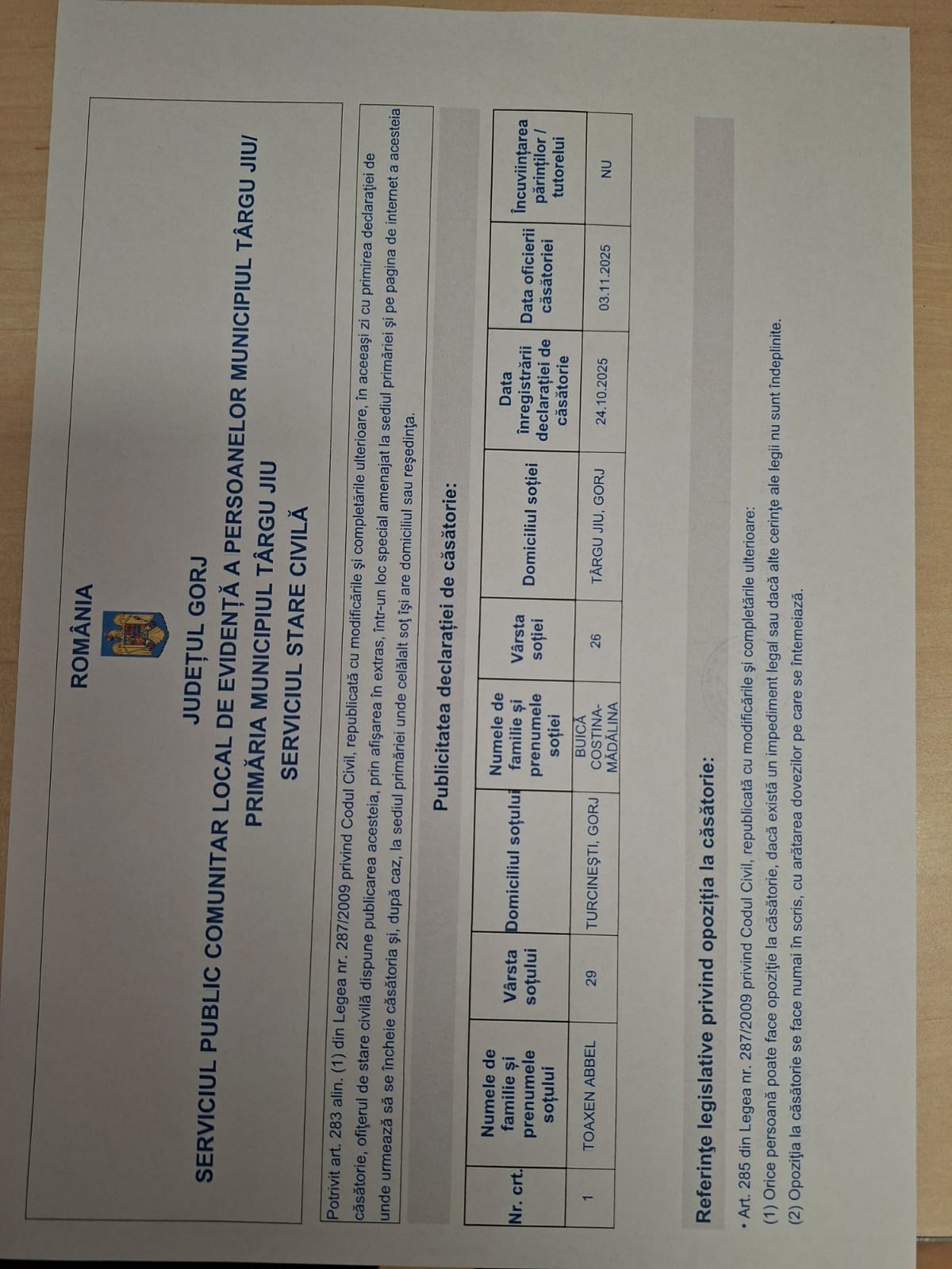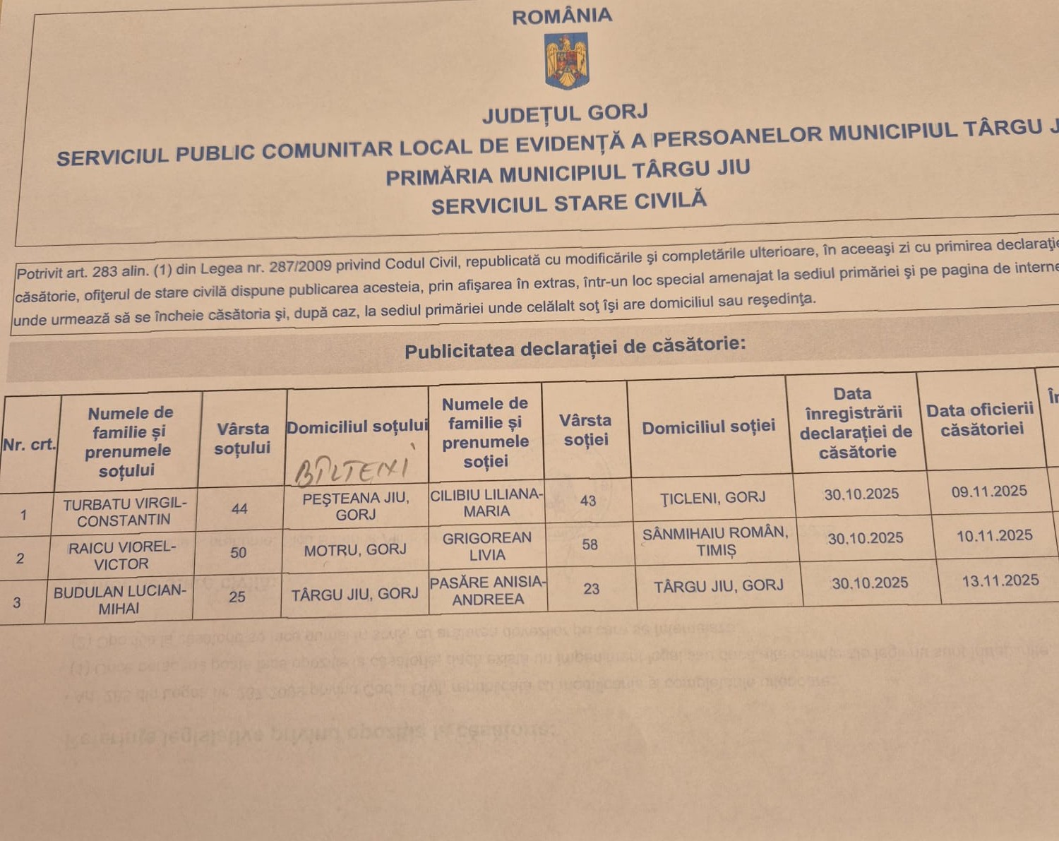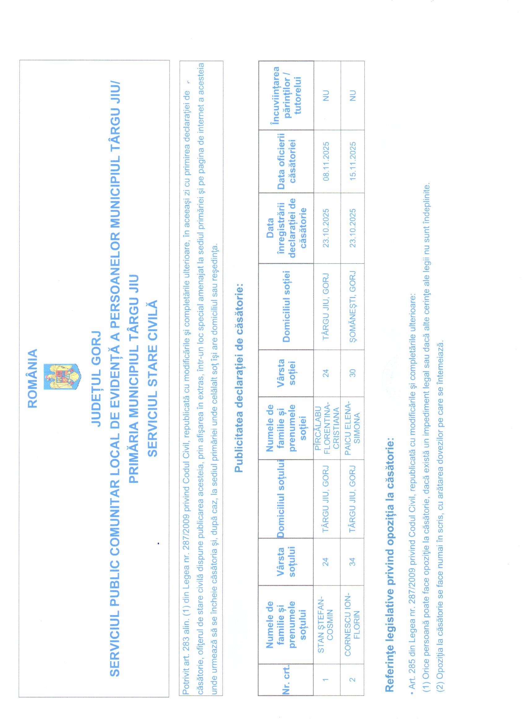 144/2025 Publicații căsătorii: 08,15.11.2025 Data înregistrării: 23.10.2025