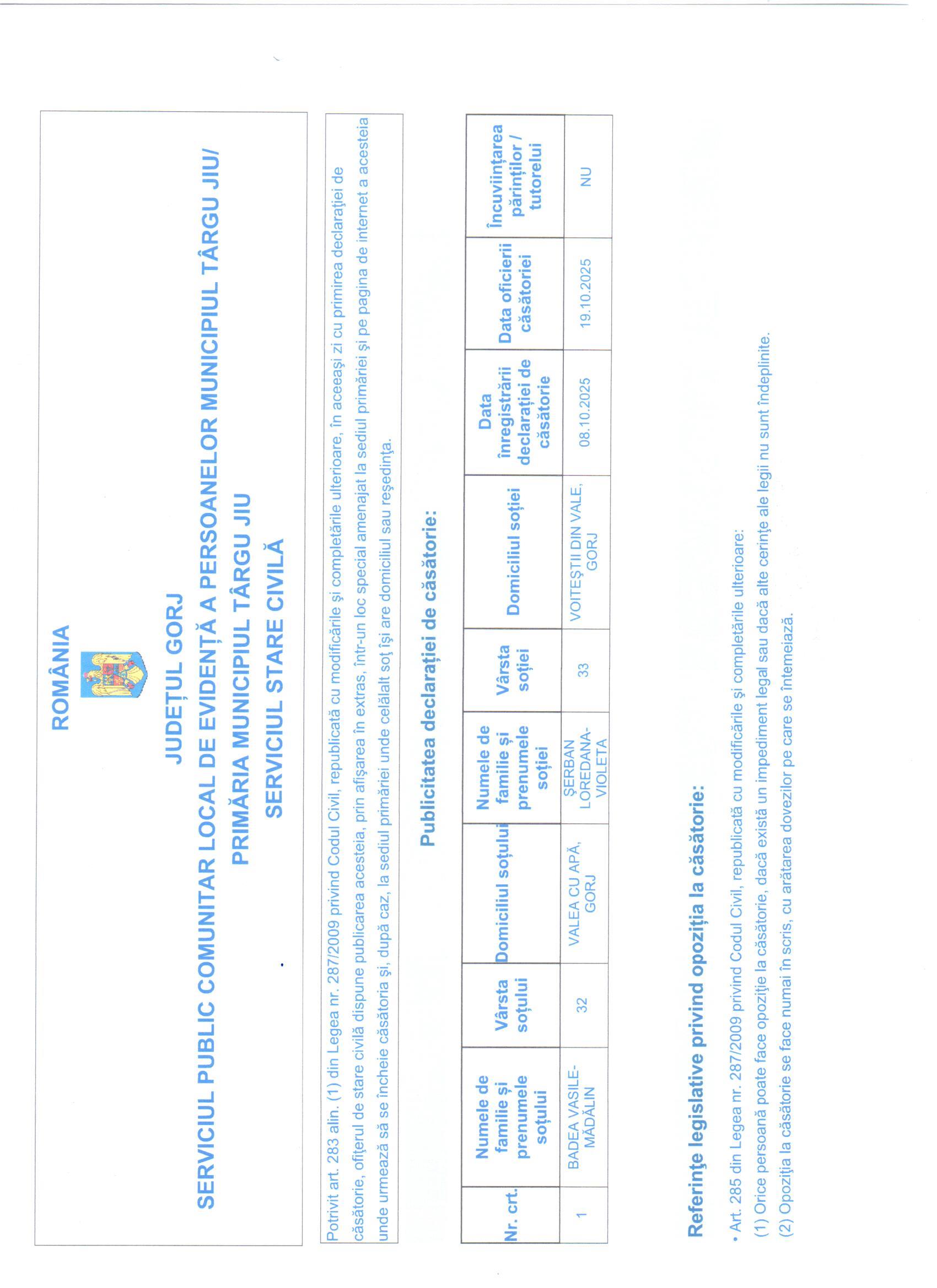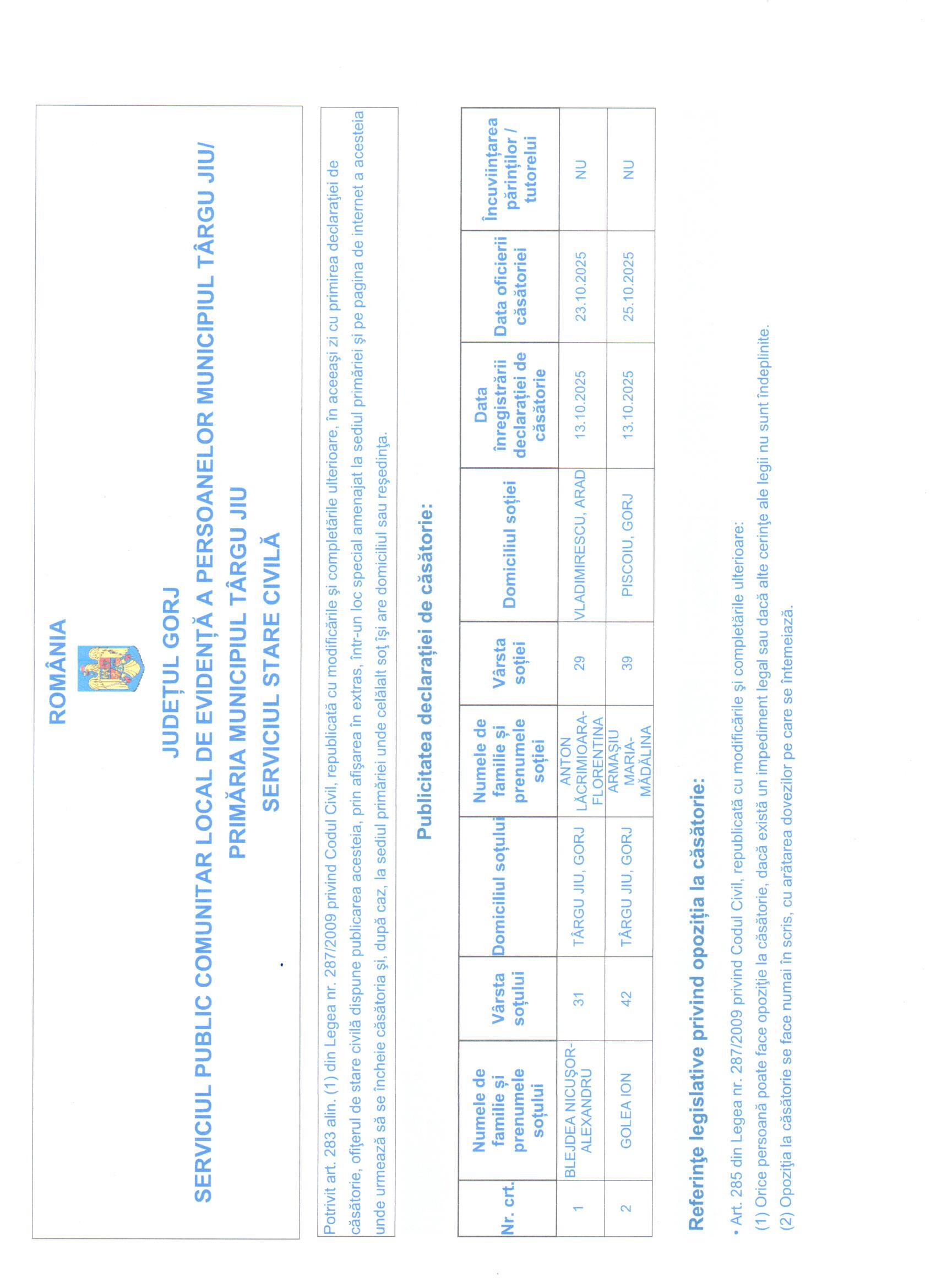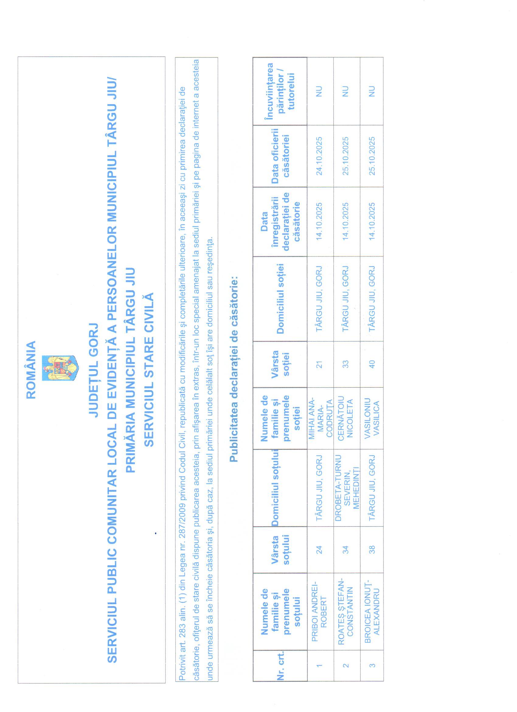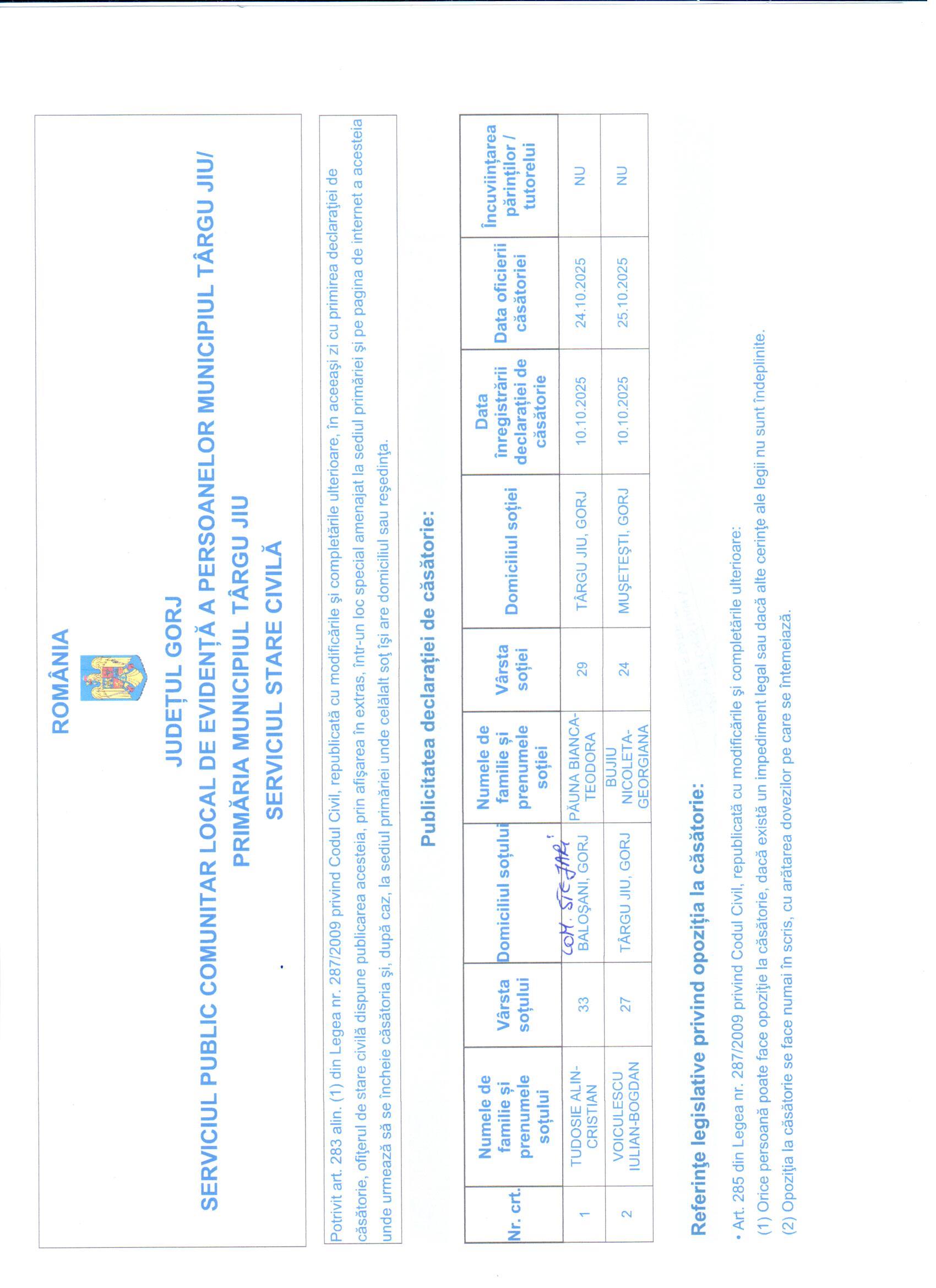 135/2025 Publicații căsătorii: 16,17,18,19,23.10.2025 Data înregistrării: 06.10.2025