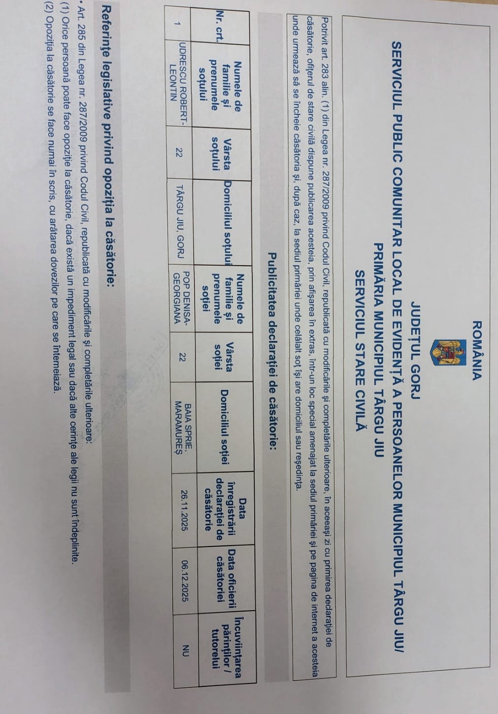 154/2025 Publicații căsătorii: 04.12.2025 Data înregistrării: 19.11.2025